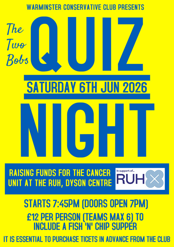 Our third quiz of the year will take place on Saturday 6th June and will follow the usual format, being compèred by The Two Bobs, with a £30 cash prize for the winning team (max team size is six). Tickets to raise funds in aid of the Cancer Unit at the RUH Dyson Centre in Bath are priced £12 and include a fish and chip supper. Tickets are now on sale and must be purchased in advance from the Club. As usual any members not attending the quiz are welcome to sit in the Lounge Bar and may purchase fish and chips in advance at £8.50. This event will sell out so please book early to avoid disappointment.